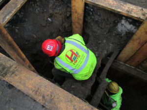 The sewer installation crew arrived on site by 7:30 pm and began digging in the roadway once the emergency DOT work permit was secured. The installation team continued to dig and was seven feet deep in the roadway by 12:30. The excavation process required a large amount of digging by hand, as opposed to digging by a backhoe, due to other utilities in the roadway.