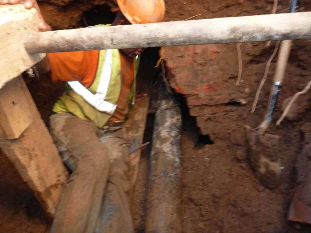 After the shoring boards were installed for safety, the repair work was completed by one of the field workers.