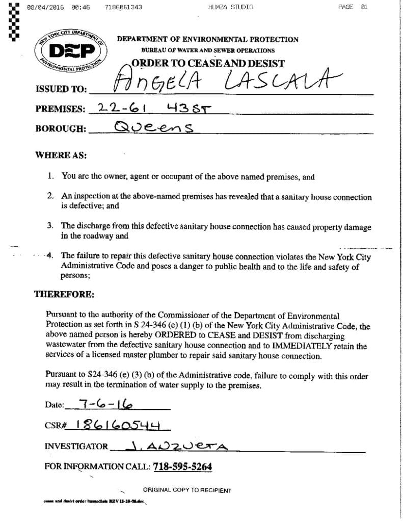 The NYC DEP became aware of the sinkhole and ended up issuing a Cease & Desist Notice to the homeowner which required him to have his sewer line repaired on an emergency basis.