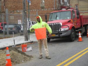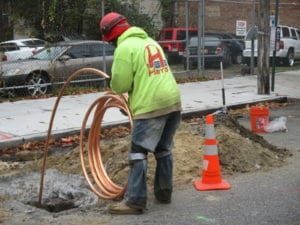 The contractor began the water main installation by opening the roadway on the “long side” of the street and had to prepare roadway tunnels for the new copper pipe installation. The contractor was working on a busy road in Brooklyn which required a flagman on site to navigate traffic.