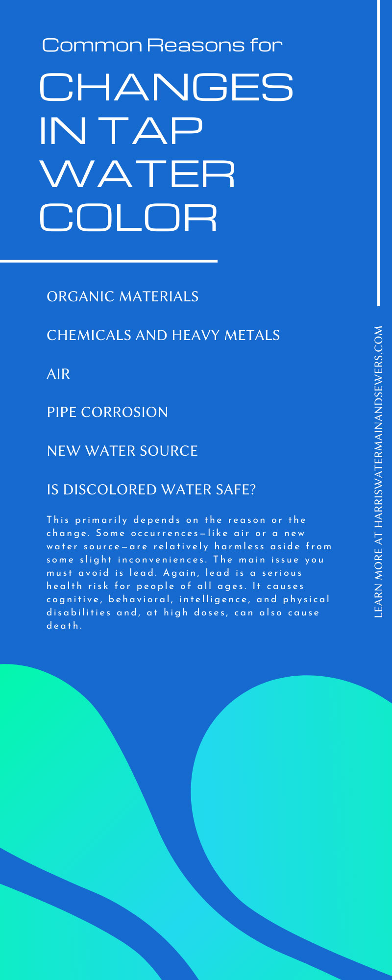 As previously mentioned, pip corrosion is one of the most common reasons for changes in tap water color. Typically, residential, commercial, and industrial buildings use iron and manganese pipes, both of which produce orange or brown tap water along with unwanted contaminants. Even HDPE plastic pipes or rubber pipes can corrode over time leading to back contaminants and discolored water. The last thing you want is to ingest microplastics from your drinking water—this can cause serious health effects. Most importantly, if you live in an older building, watch out for lead pipes. As lead pipes corrode, the lead leaks into the tap water. Lead poisoning is a serious health concern that raises the risk of cognitive and physical issues in anyone who contracts it. Lead poisoning is also fatal in larger concentrations. If you suspect corrosion in your pipes, have a professional plumber or repairman service the area as soon as possible rather.