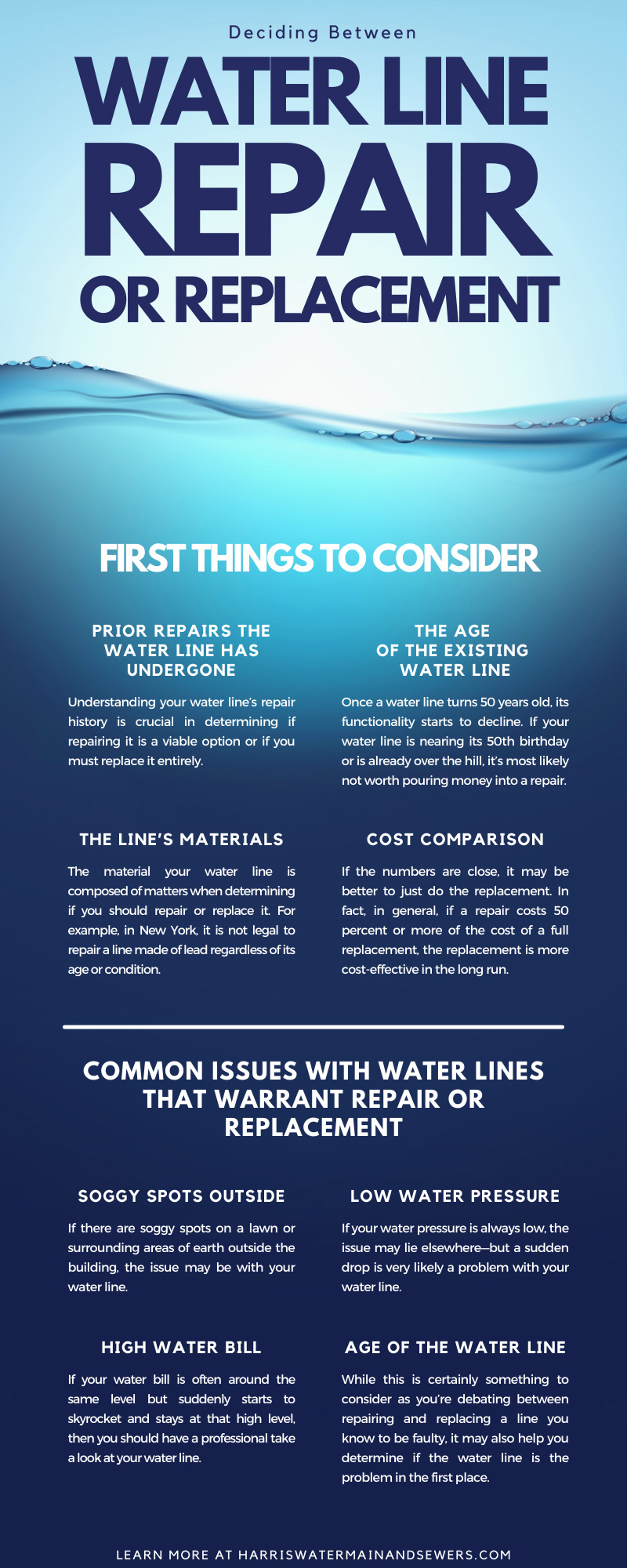 When a water line breaks or stops functioning properly, you must decide if it’s better to repair the broken part of the line or if it would be more prudent to replace the entire line. For help deciding between water line repair or replacement, check out this guide or call Harris Water Main and Sewer Contractors for more in-depth information.