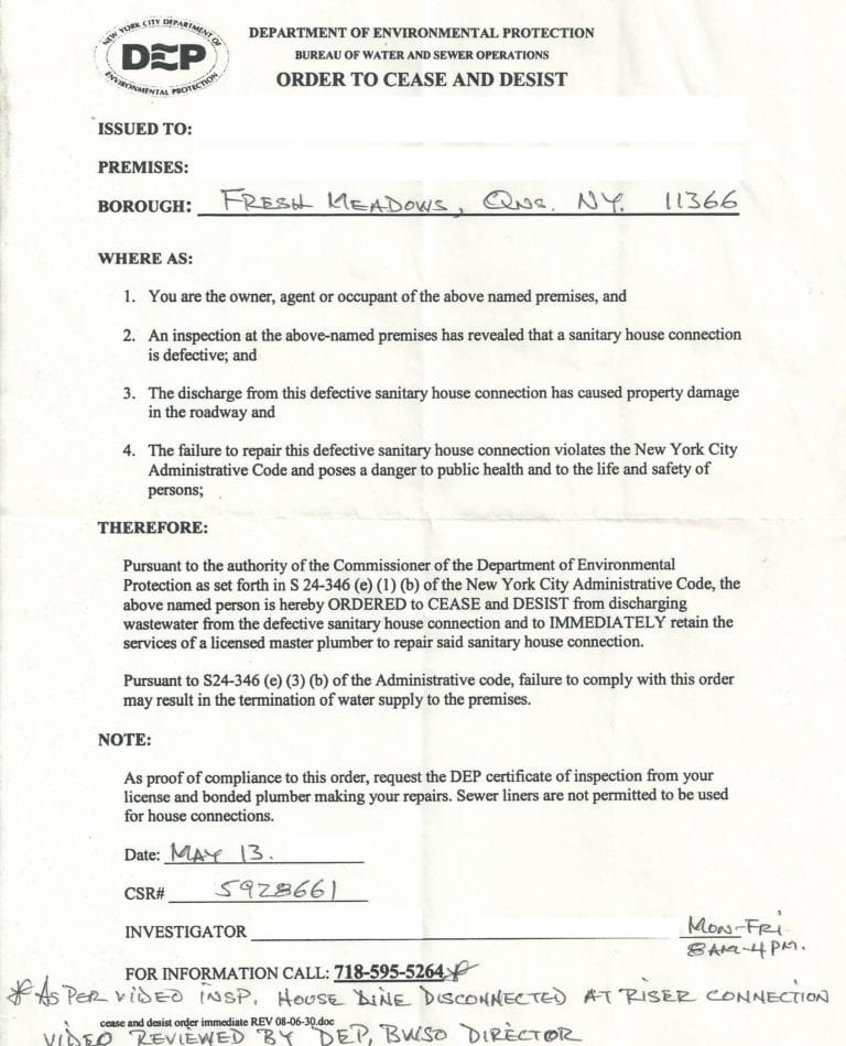 A Cease & Desist notice is a violation issued to a property owner after the DEP has become aware that the sewer line is broken. When this happens, it is crucial to get in contact with a contractor providing emergency sewer services specific to NYC DEP Violations in order to resolve the issue quickly.