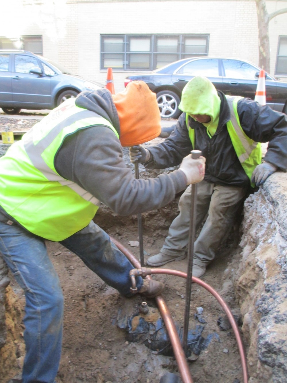The water main installation crew worked straight from 6 AM until 4 PM when the new 3” ductile iron sprinkler main and domestic water line was installed and inspected by the NYC DEP.  After the inspection was completed, the installation crew began backfilling the holes, compacting the dirt and cleaning the street before the roadway was paved the very next day.