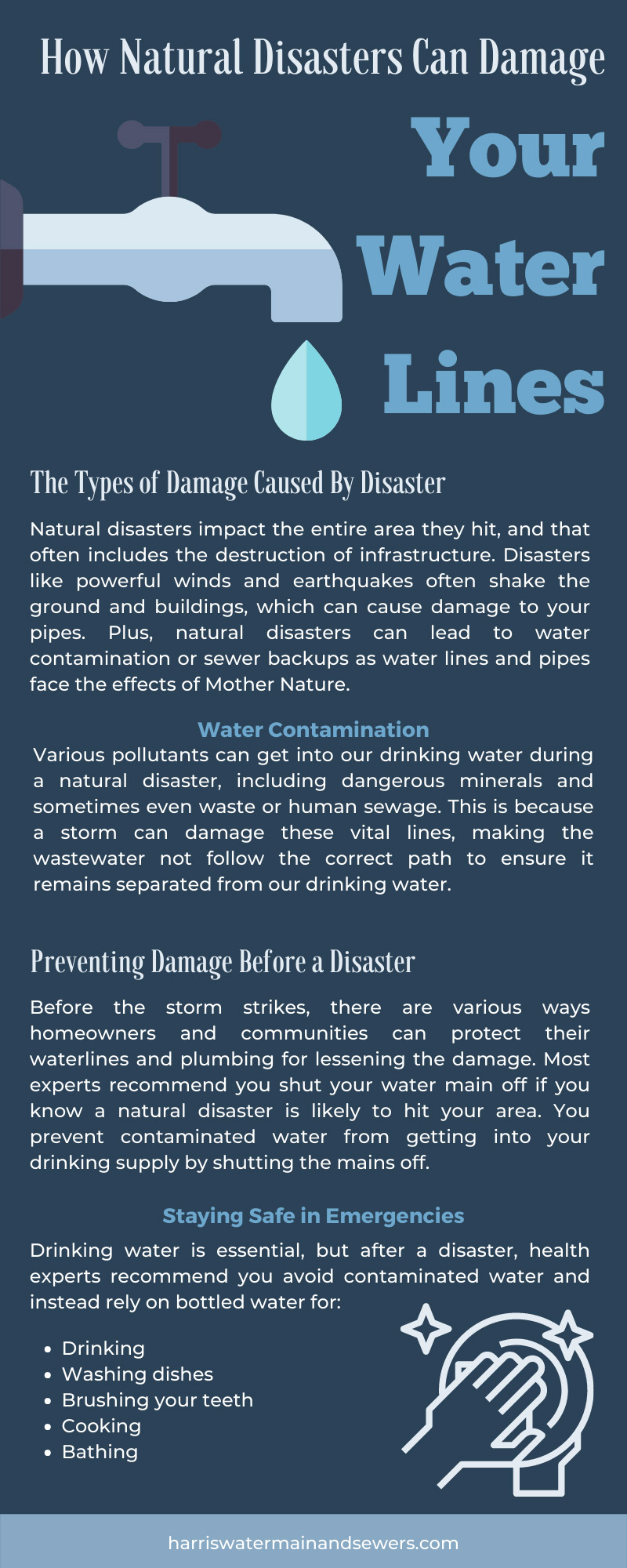 Natural disasters impact the entire area they hit, and that often includes the destruction of infrastructure. Disasters like powerful winds and earthquakes often shake the ground and buildings, which can cause damage to your pipes. Plus, natural disasters can lead to water contamination or sewer backups as water lines and pipes face the effects of Mother Nature.