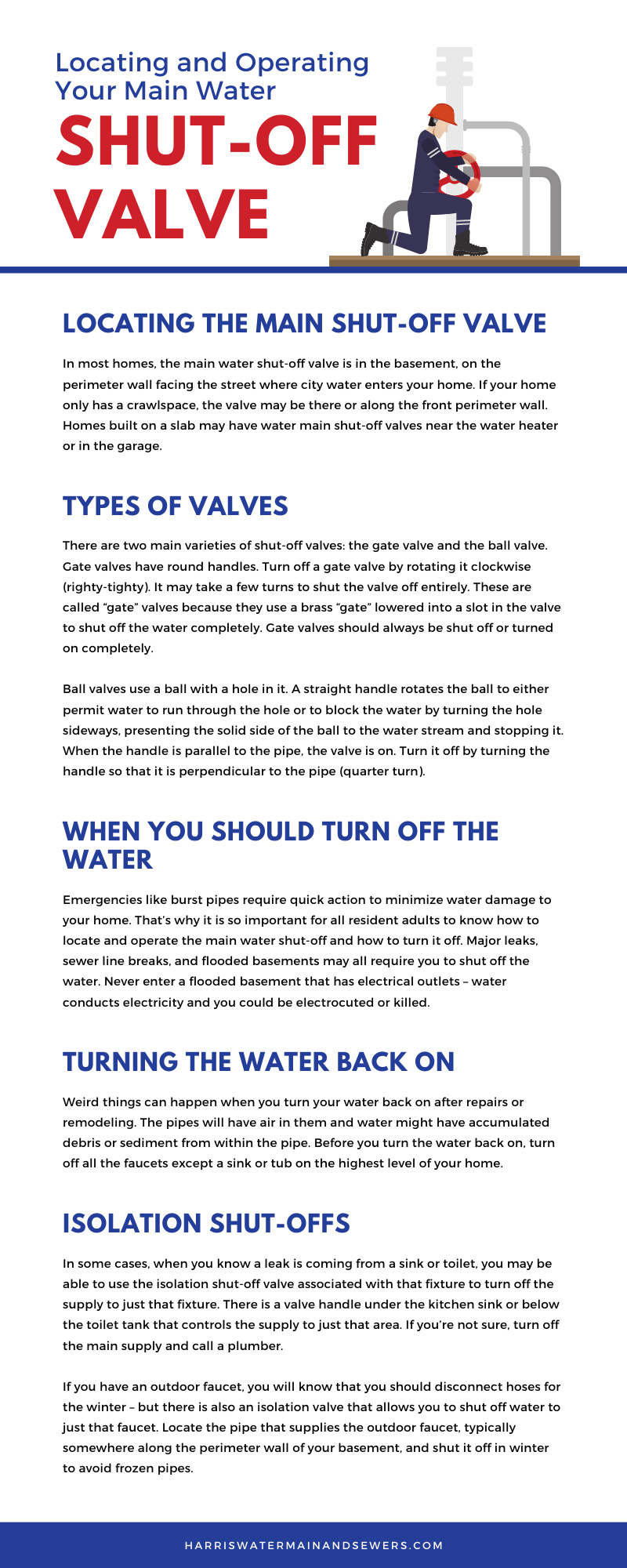 All adults in your home should know about locating and operating your main water shut-off valve. This is critical in case of emergencies like burst pipes and leaks. Many plumbing repairs require that the water be shut off until the repair is complete. Sometimes, the city will shut off water to your home when making repairs to water mains in the street. Other times, your city may perform routine maintenance that affects your water supply like flushing fire hydrants.