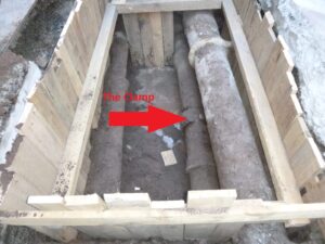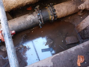 When digging on the first day, Harris became aware that there was a small leak on the city water main and slowly started to intensify. Harris contacted DEP on an emergency basis who was able to install a clamp on the city main, as a temporary solution.