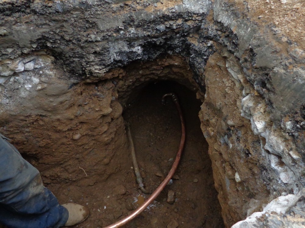 The copper water Line installation started at 8:30 AM with the crew excavating the “tap hole” in the roadway, the water had to be shut off before the new pipe could be installed. The other members of the installation crew began excavating additional holes in the roadway and on the property. This particular job required special safety precautions including a flagman to assist traffic in flowing as usual.