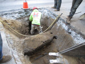 Harris Sewer began working under the DOT restricted hours of “weekends only” and expected the complete installation to take 2 weekends to complete. The roadway was opened when Harris encountered a large amount of utilities. Most sewer replacements allow for a backhoe to dig down to the city sewer before the pipe is replaced. The utilities do not leave enough space for the backhoe and require digging by hand. Digging by hand can double the estimated time to install the new sewer pipe. Harris had to plan strategically and decided to dig on top of the city sewer, this would allow for partial machine use, along with digging by hand.