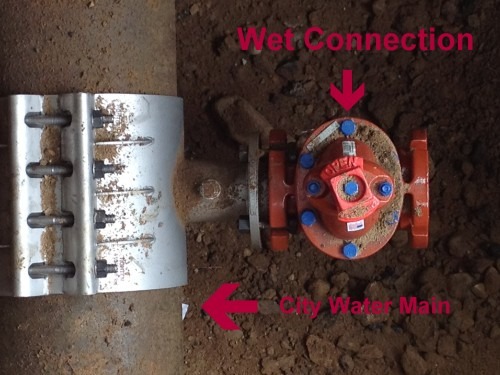The DEP had to perform the repair in the middle of the night as they had to shut down the city water main for the entire block and wanted to avoid inconveniencing the surrounding neighbors. The repair of the city water main was completed within 48 hrs and the Harris crew was able to successfully complete the installation of the new wet connection before the next morning. Harris Water was on the jobsite early that morning waiting for the DEP to complete the work which would allow them to finish the installation and pass DEP inspection of the new