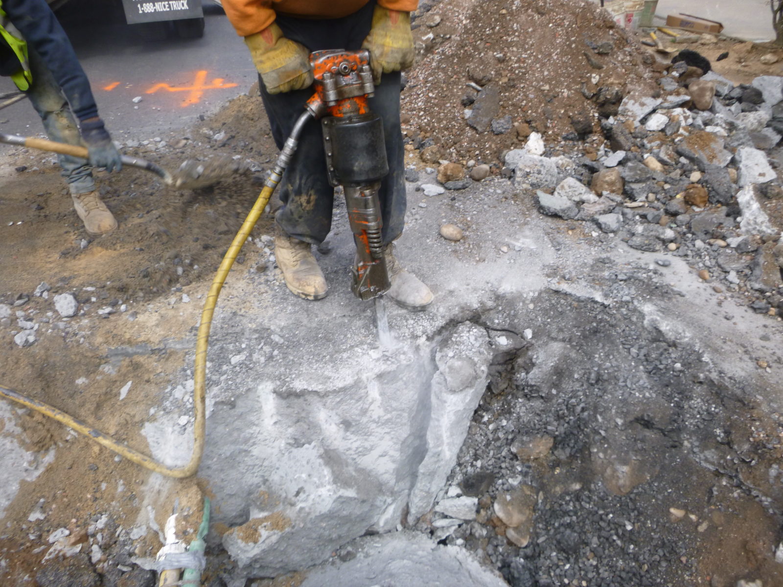 We now had to obtain an emergency DOT permit to excavate in the roadway and repair the broken section of sewer pipe. First we started by jack hammering the roadway.