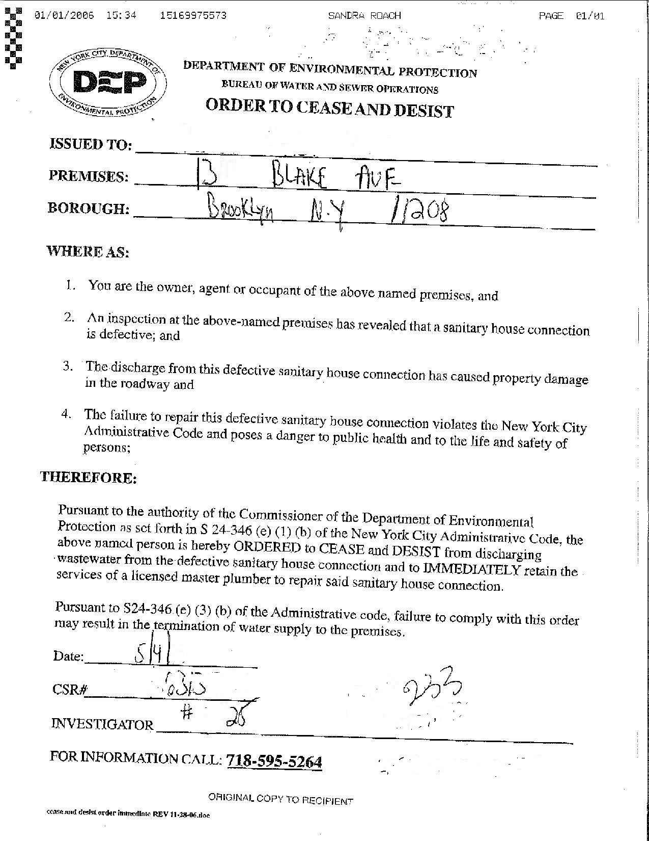 The owner was issued a DEP Cease & Desist Notice which required them to have the sewer line repaired by a licensed and bonded water main and sewer contractor.