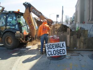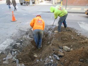 After several hours of digging, the new pipe was installed and the installation team was now waiting for DEP to arrive before closing the sidewalk excavation.