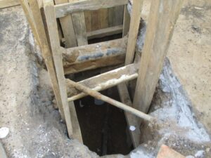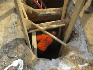 The crew worked late on the first evening so they could stay on schedule to complete the final DEP inspection on the second day. On the second day they reached the city sewer by late afternoon and began preparing for the new sewer pipe install.