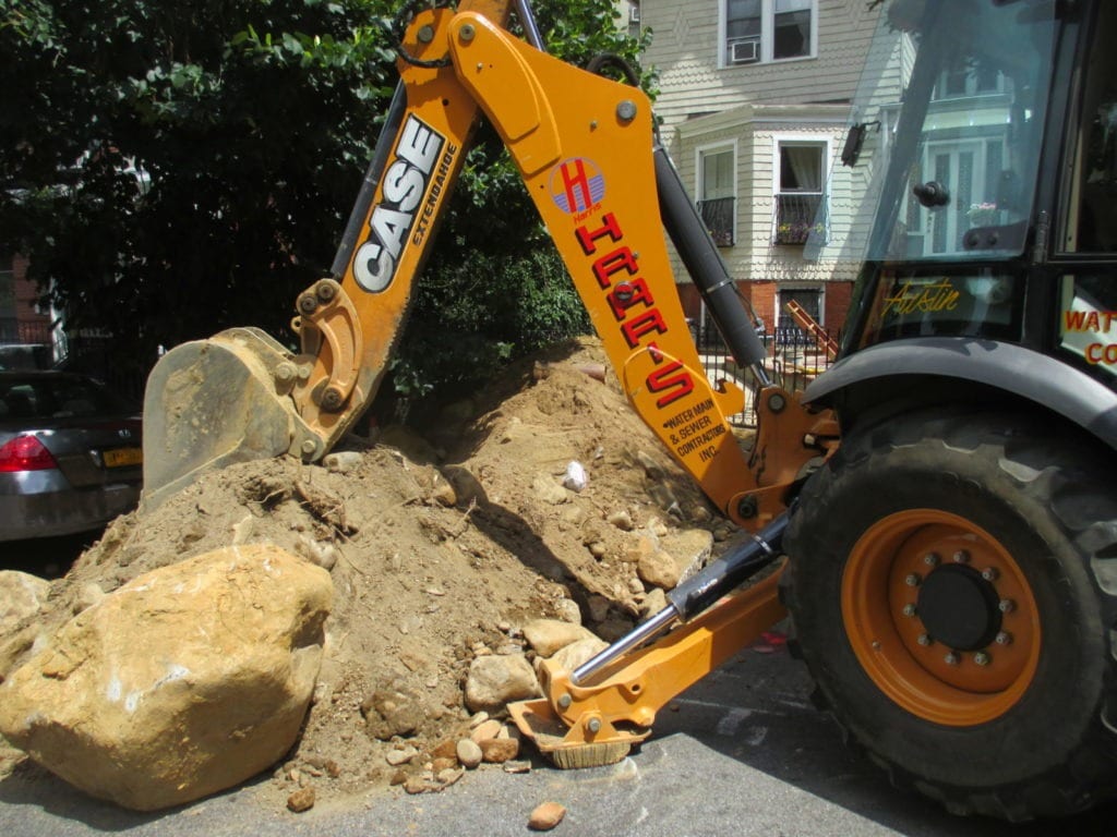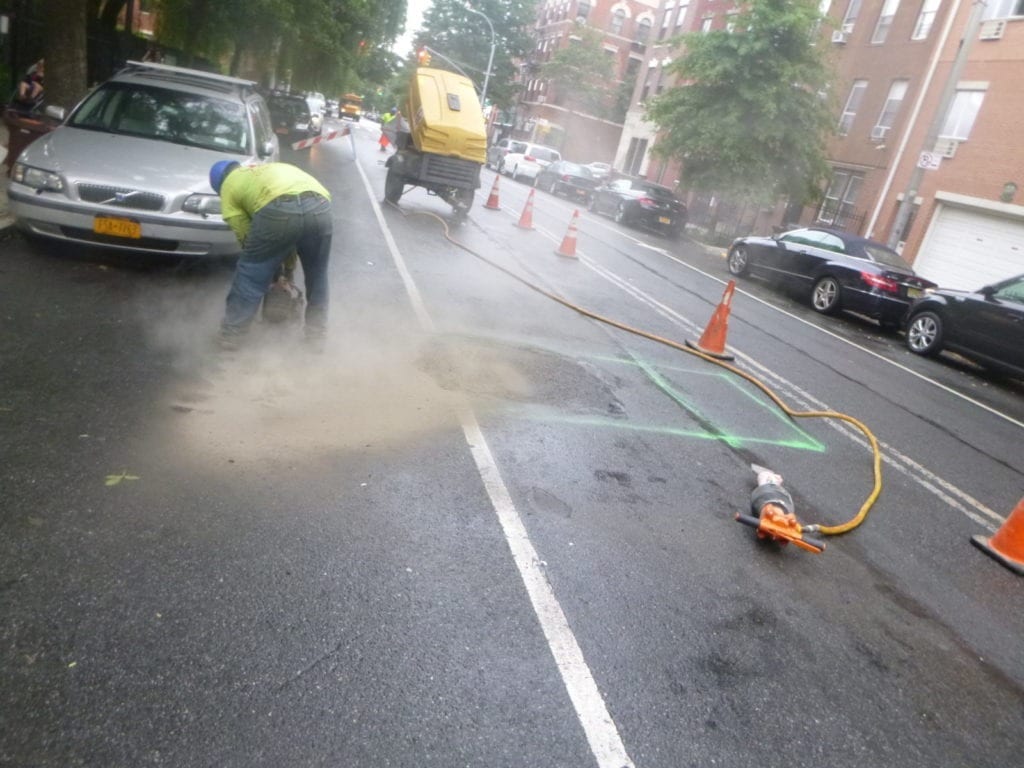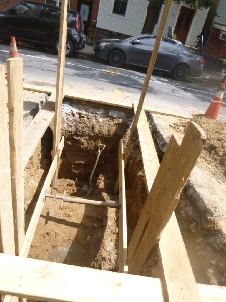 Next the crew continued to dig with a backhoe when the encountered large utilities in the roadway which now required the crew to dig by hand as opposed to the standard with a backhoe.