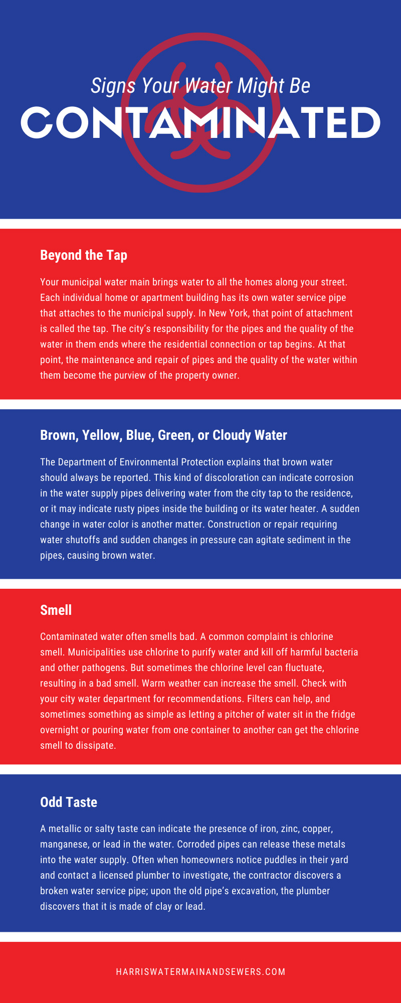 If you notice any of the above signs your water may be contaminated, contact the DEP in New York City or your local water supply utility if you live elsewhere. Attending to the issue sooner rather than later can save money in repairs and reduce health hazards.