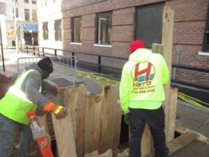 Once the location of the break has been determined, the licensed plumber will obtain all required DEP and DOT permits in preparation of the sewer repair work. Most excavation for a job like this will require a backhoe and usually requires an excavation of up to 14’ in depth.
