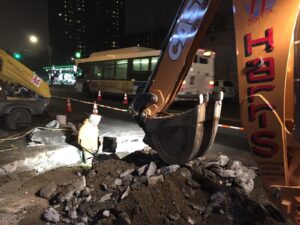 It was now 8PM and the water main installation crew requested that the main office obtain the emergency DOT permit to begin working. Lucky for the homeowner the other utility company was kind enough to start digging in the roadway to speed up the new copper water main installation process.
