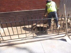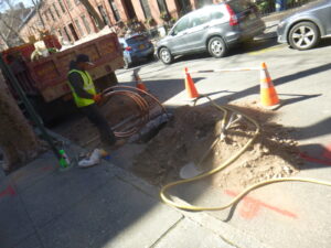 Now that the water was turned off, the on-site crew can continue on the other excavations to be made. Once completed the crew will begin making tunnels below ground. Once the tunnels are completed, the new cooper pipe is installed from one hole to the next.