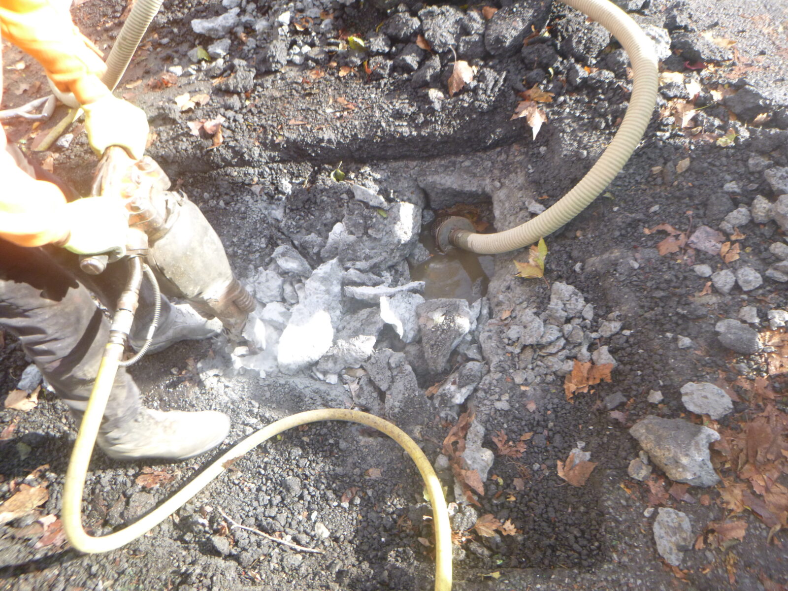Now that the water was closed on the city main the work crew continued to excavate the roadway and sidewalk before the new 3″ ductile iron water main could be installed.