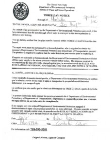 On Tuesday morning the buildings super at 200 Worth St. in Manhattan, contacted DEP (Department of Environmental Protection) after becoming aware of a small stream of water entering through the buildings foundation wall. The DEP showed up within a few hours and issued a Three-Day Notice for the building to repair the sprinkler line.