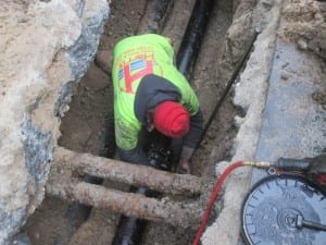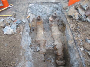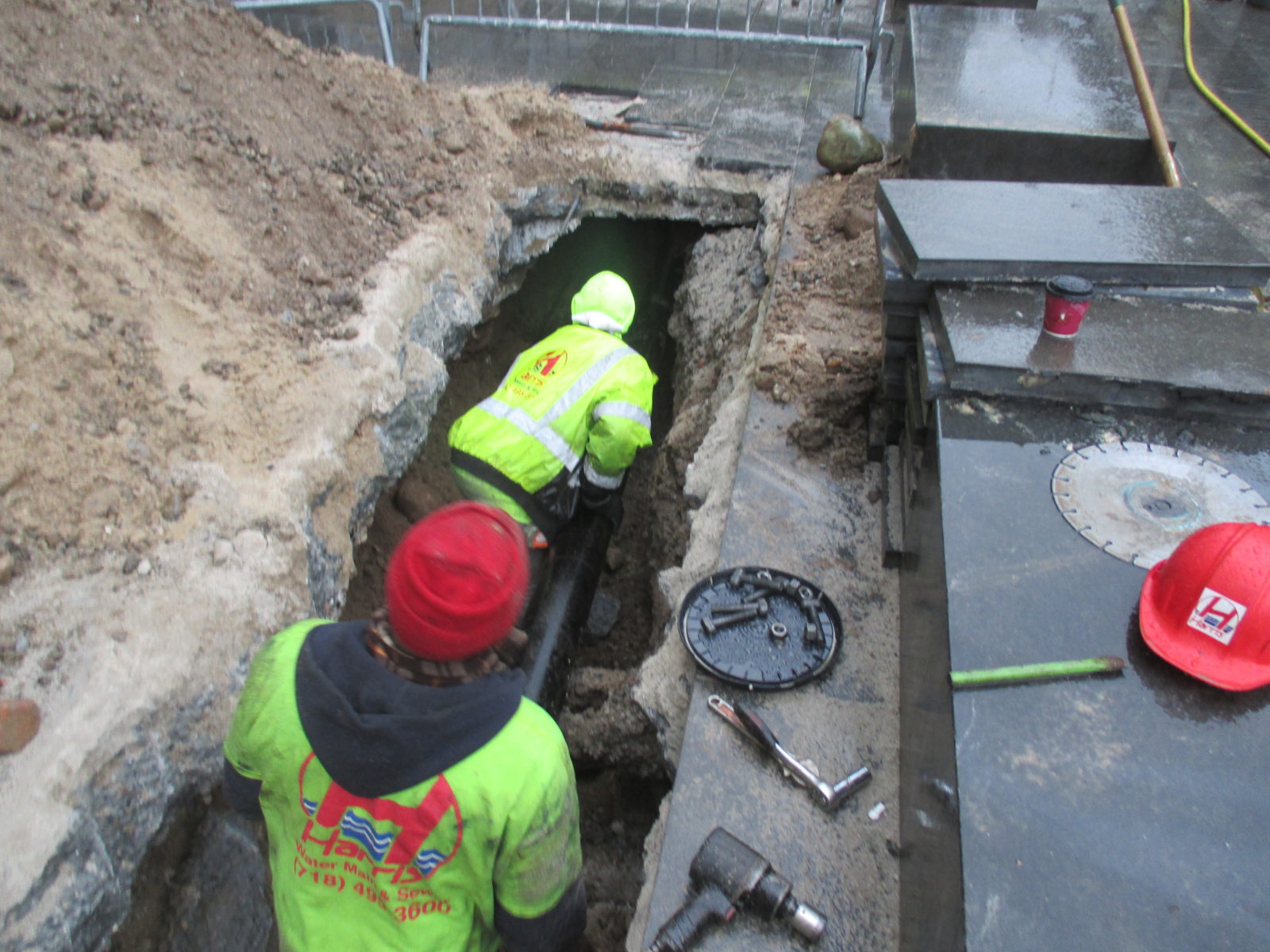 Harris started installing the new pipe over the first night of working and obtained DEP inspections on a portion of the new pipe. While excavating for the sprinkler it had become apparent that the domestic water main was in poor condition as well and made sense to replace both of the pipes at the same time. A building of such importance could not afford to begin excavating on the property anytime in the near future.