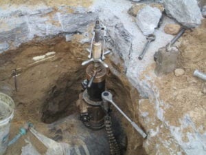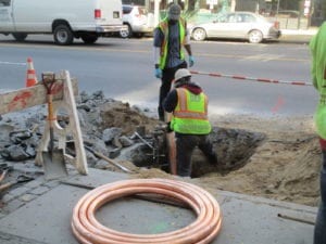 The team was quick to plug the hole in the city main with a wood broom stick until the DEP arrived to install the new tap connection. Harris also installed a sleeve around the city main to ensure that the old tap location would not become of any problem in the future.